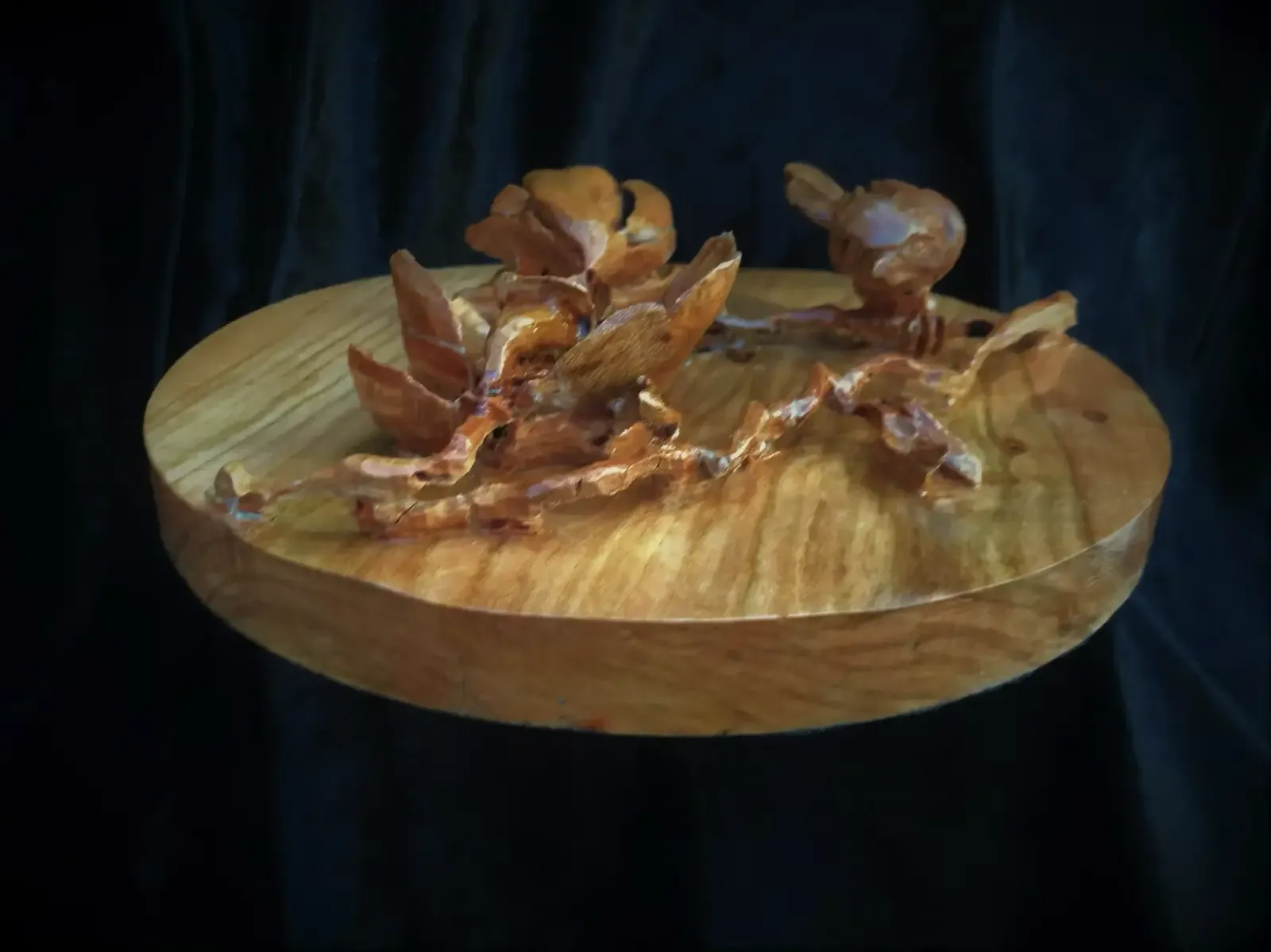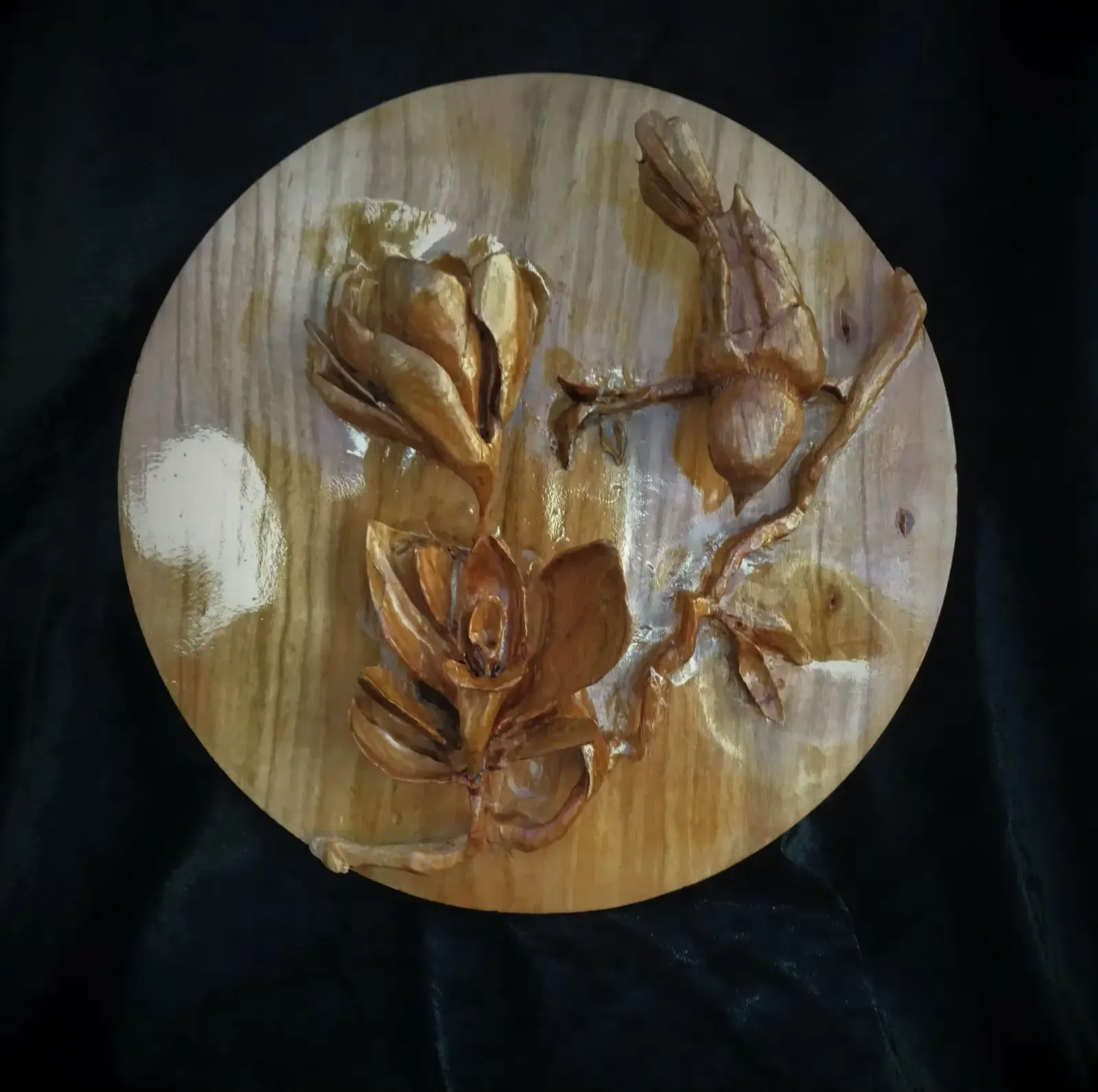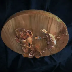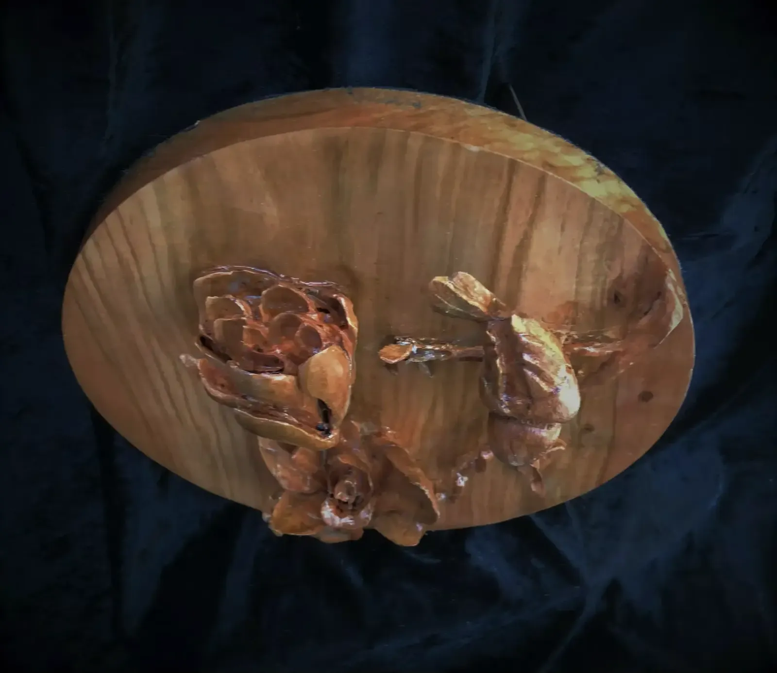 The carving was created on a cherry round and was a difficult piece to carve as the outer areas were lovely to carve but the centre was dam dry, despite many duckings to add moisture. I’m afraid a lot of mitre glue was used to keep things together. The idea was gleaned from a Pinterest article showing how an artist builds up a picture out of plaster for wall decorations. It was finished in a clear acrylic spray.