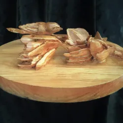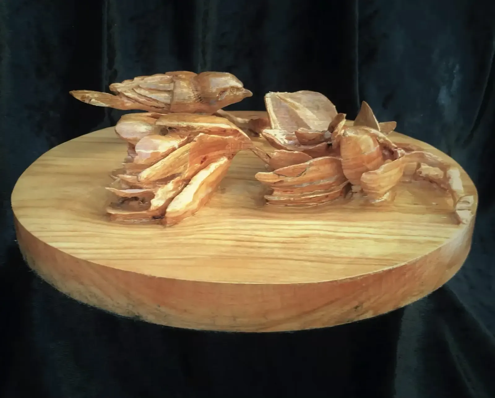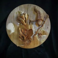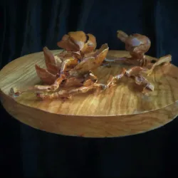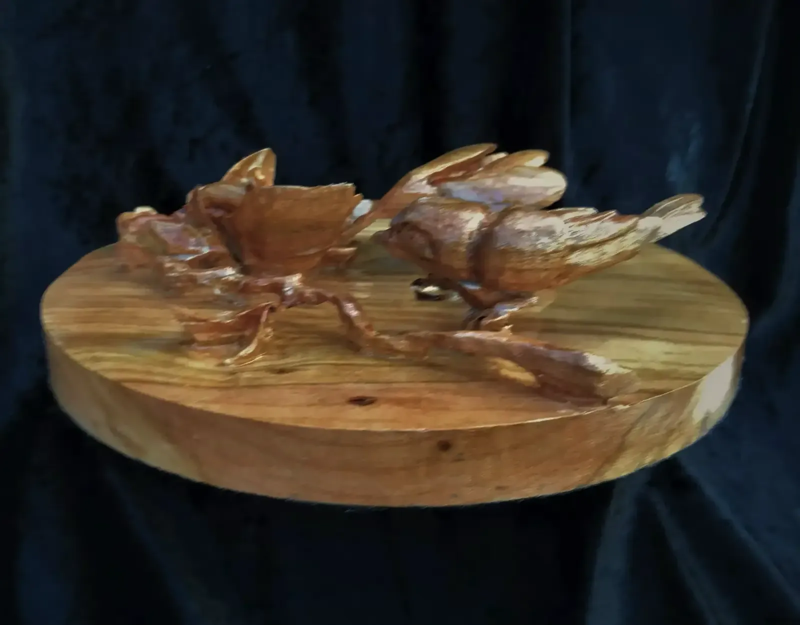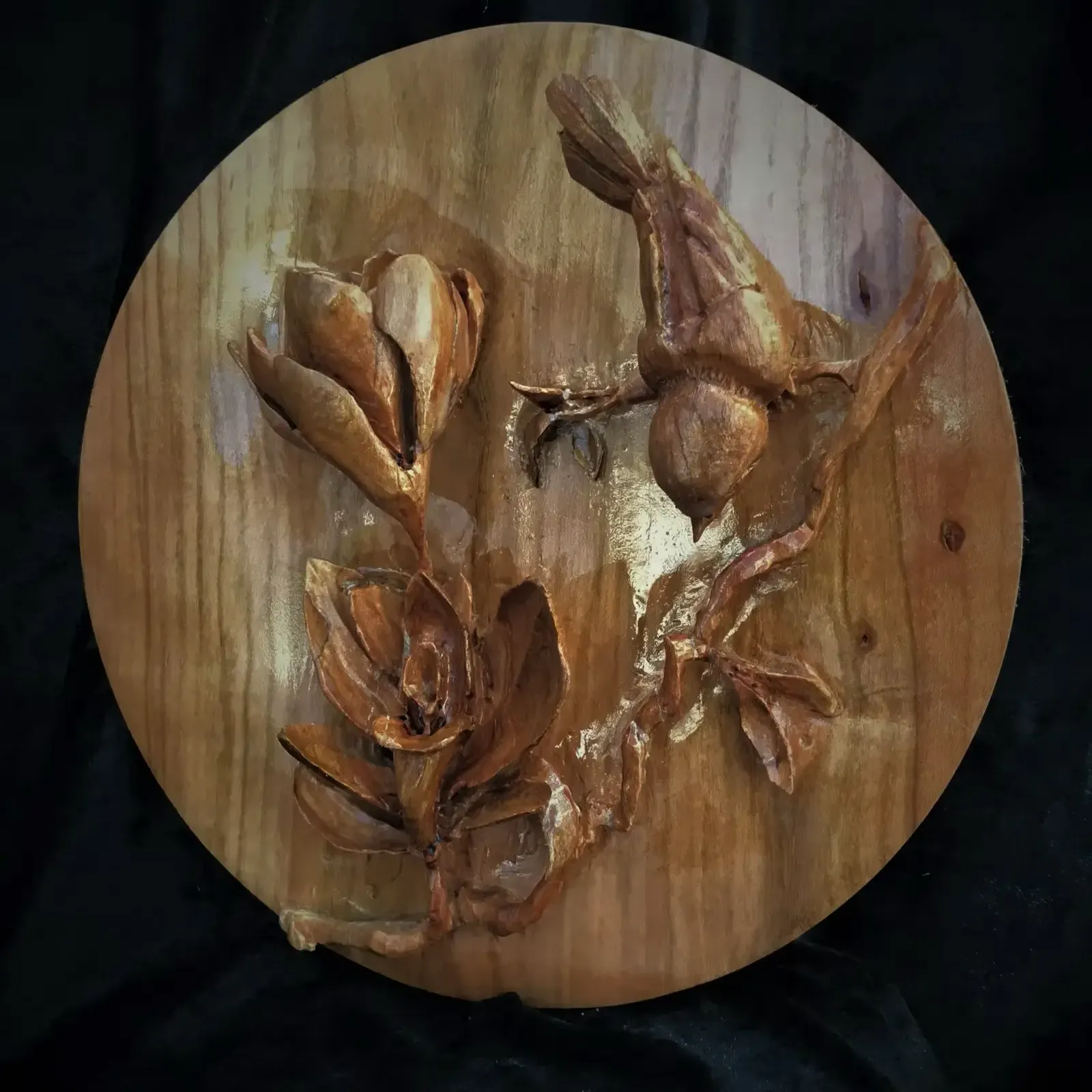 The carving was created on a cherry round and was a difficult piece to carve as the outer areas were lovely to carve but the centre was dam dry, despite many duckings to add moisture. I’m afraid a lot of mitre glue was used to keep things together. The idea was gleaned from a Pinterest article showing how an artist builds up a picture out of plaster for wall decorations. It was finished in a clear acrylic spray.