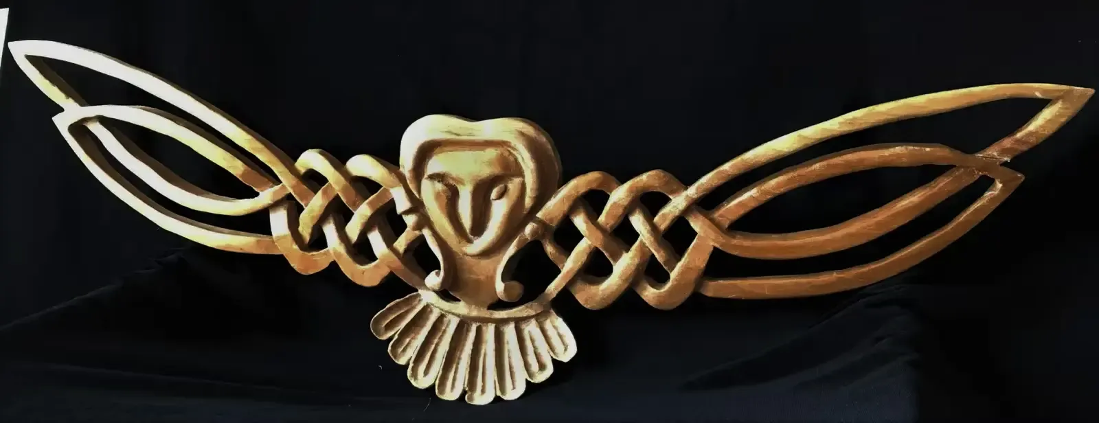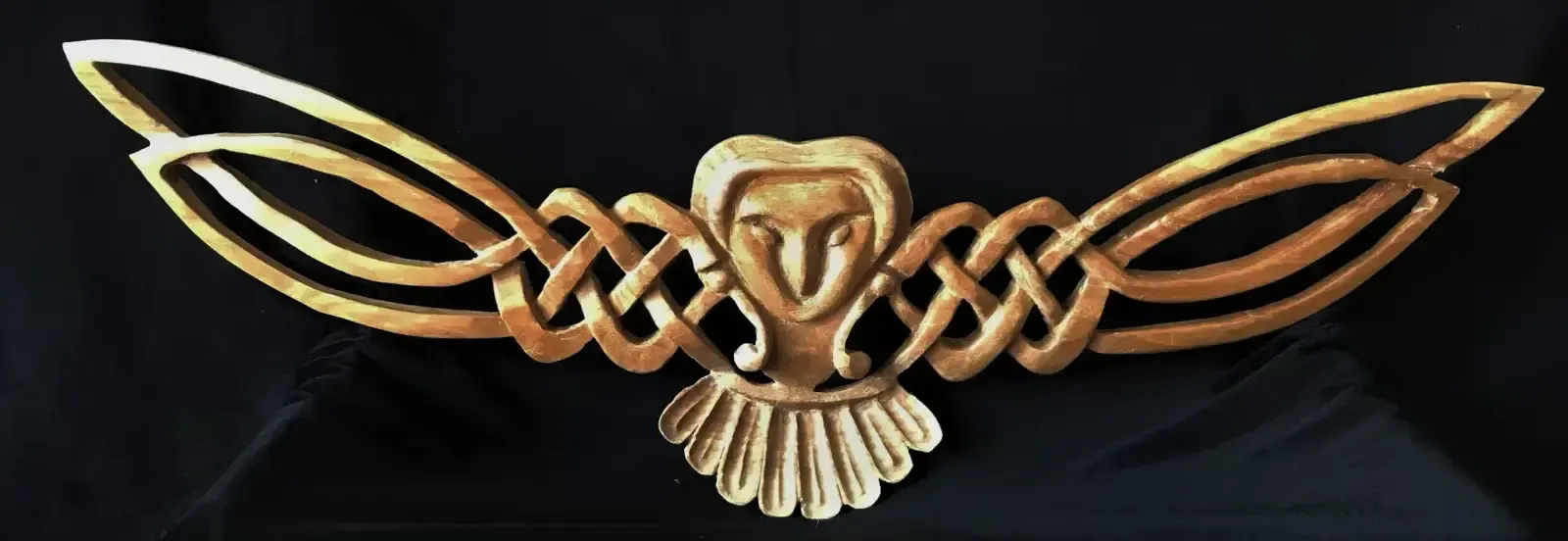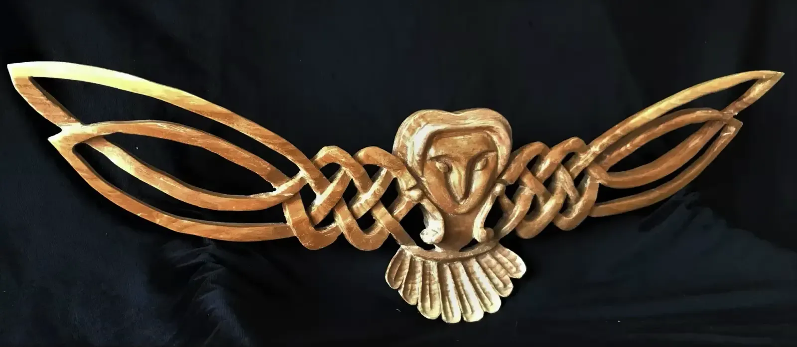 After seeing a piece of jewellery with an owl on it, I got this idea to carve a Celtic Owl. Birds of Prey have fascinated me since I was a kid in juniors. I and a friend were scared witless by a Peregrin falcon which swooped down and took a couple of sparrow chicks from only a few feet away from where I was sitting in the playground. All we heard was a great commotion of wings and the screech of the chicks before the Peregrin took to the skies with its prey. Barn owls are a particular favourite and I’m privileged to be able to watch them at a nearby reserve if I can get up early enough to go and see them. I’m also greatly influenced by Celtic art, so the amalgamation of the two seems only appropriate to me.