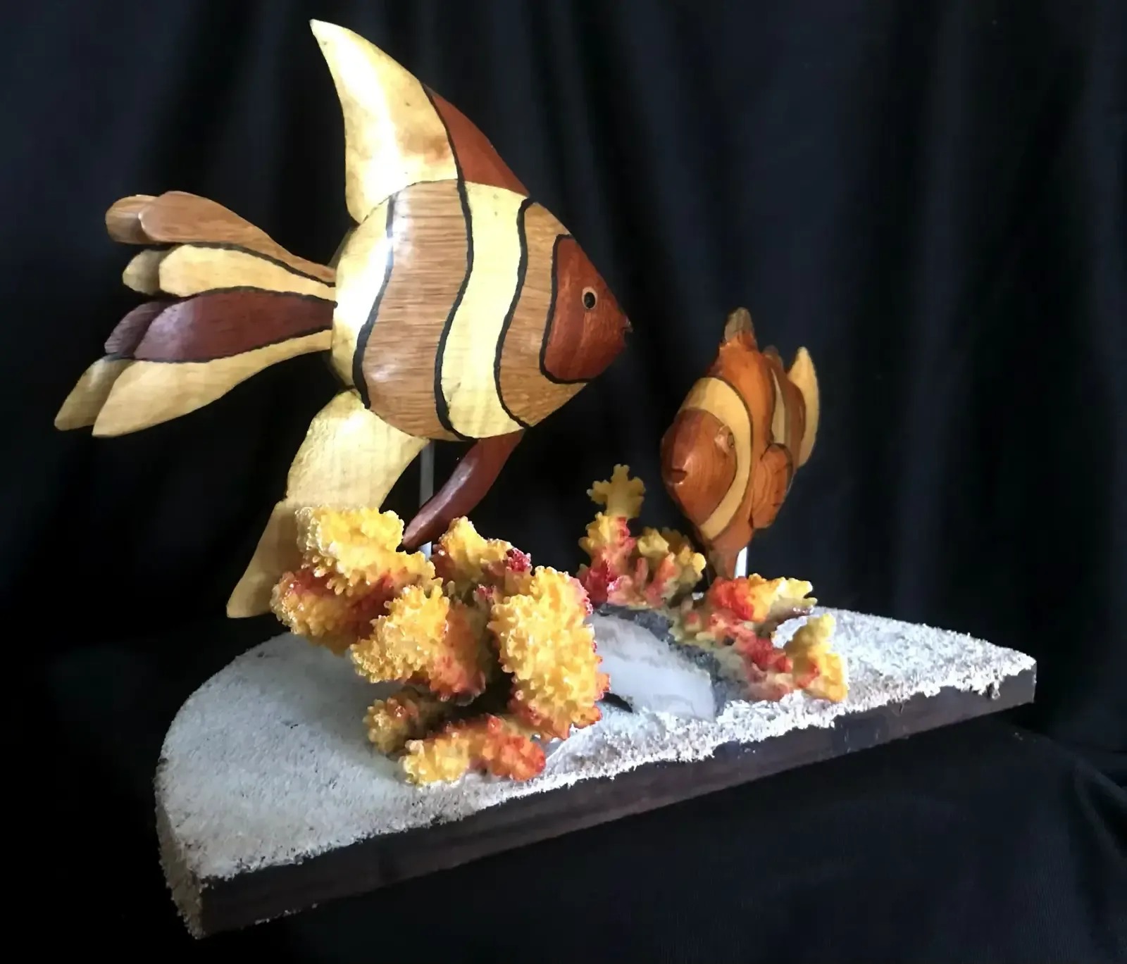 The Clownfish is made out of Juniper wood and lime with a hint of walnut between. I spliced the pieces together first and then carve the shape afterwards. The Angelfish is made out of mahogany, oak and birch woods, then the fins were stuck into place after being shaped on a bobbin sander. Not bad for a first attempt. They are finished off with Danish oil to give a wet look and the coral is plastic, not real, a leftover from an aquarium I once owned, nothing goes to waste.
