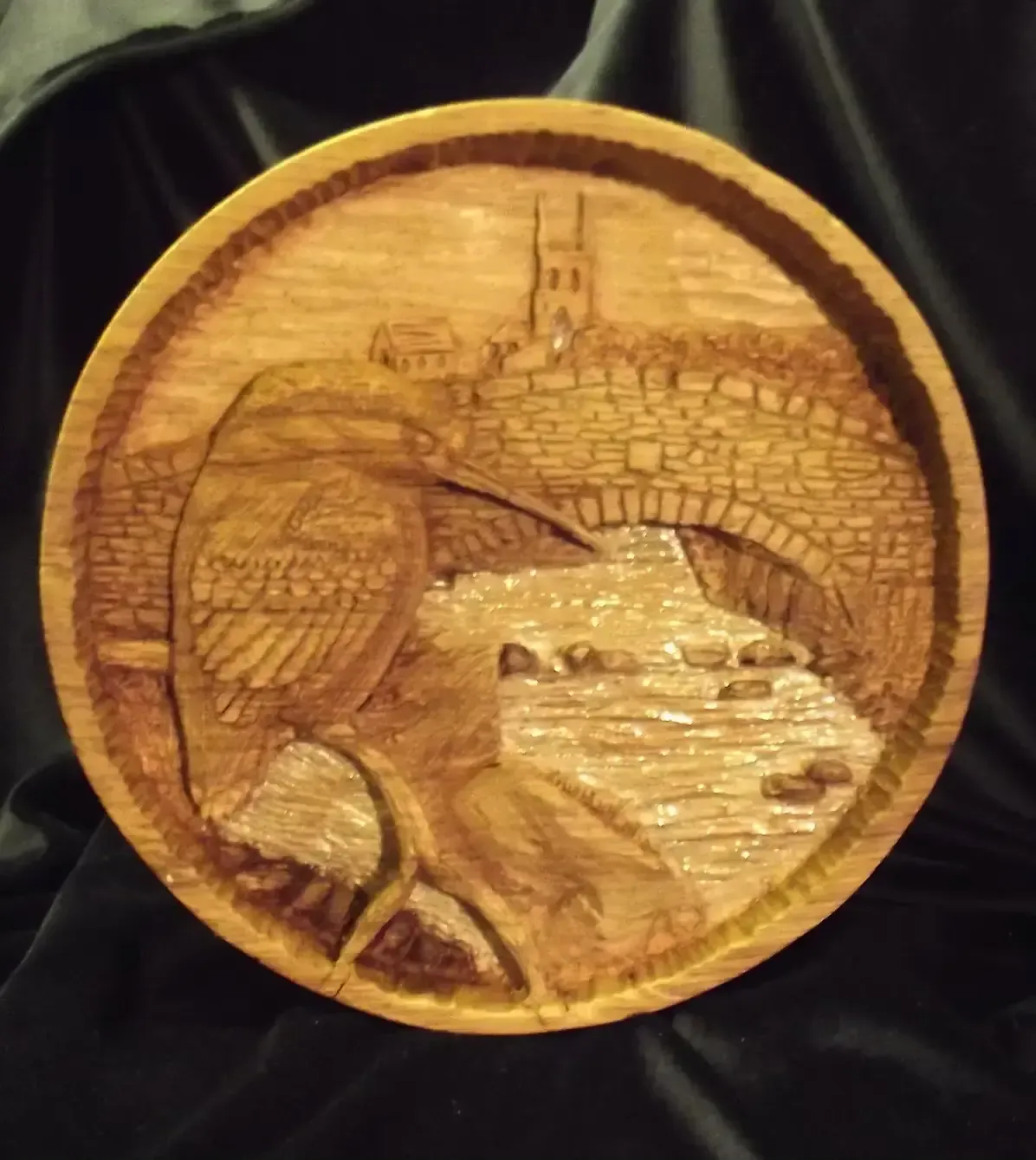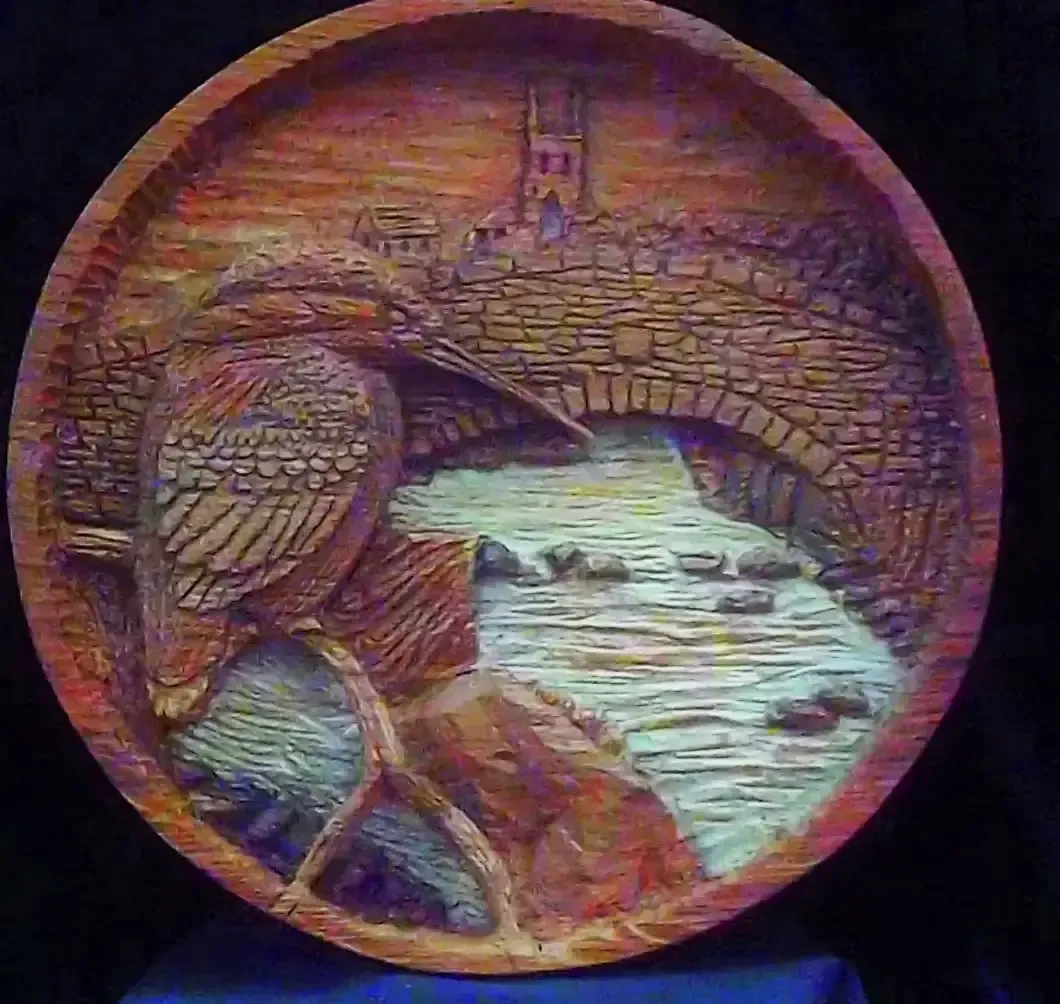 I started this carving of a kingfisher one September and was meant to be given as a Christmas present to my ‘inlaws’. Unfortunately, Dad died at the end of October. We shared a love of gardening, birds and nature, He was always there forhis grandchildren and us, offering wise advice, practical help and quirky musing on the world. He is sadly missed. It now resides in front of his chair where Mam can look on it. The Kingfisher is carved out of an oak turning round and polished with beeswax. The water area has been treated with a white ash stain and lightly lacquered with a satin finish.