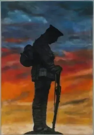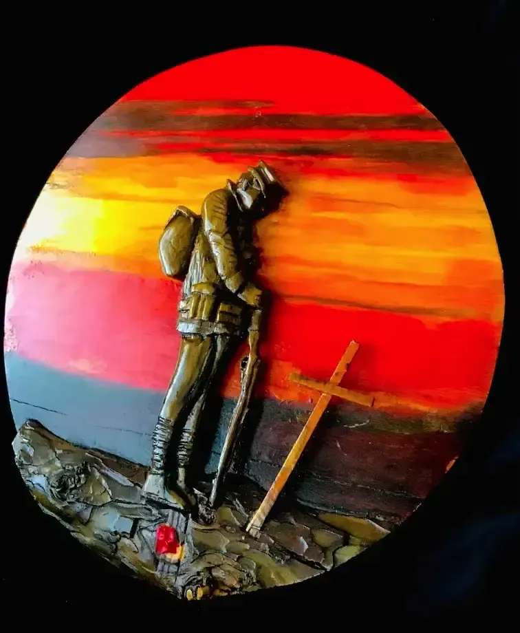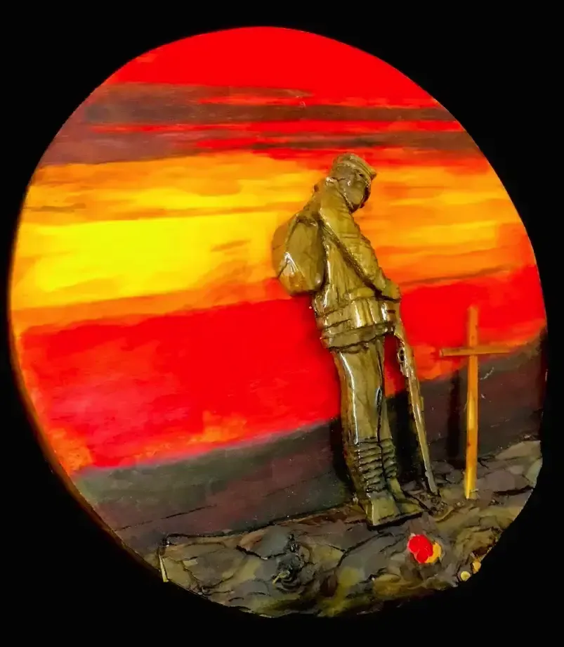 After talking to the landlady and attending a remembrance service one year, I was drawn to creating my own homage to our fallen in both world wars. This one is dedicated to the soldiers of the first world war. The piece is created on a spalted round of birch and I’ve used the existing grain to highlight the background with ink stains to get the vibrancy of the sunset. The soldier is carved out of walnut and the ground is juniper bark.