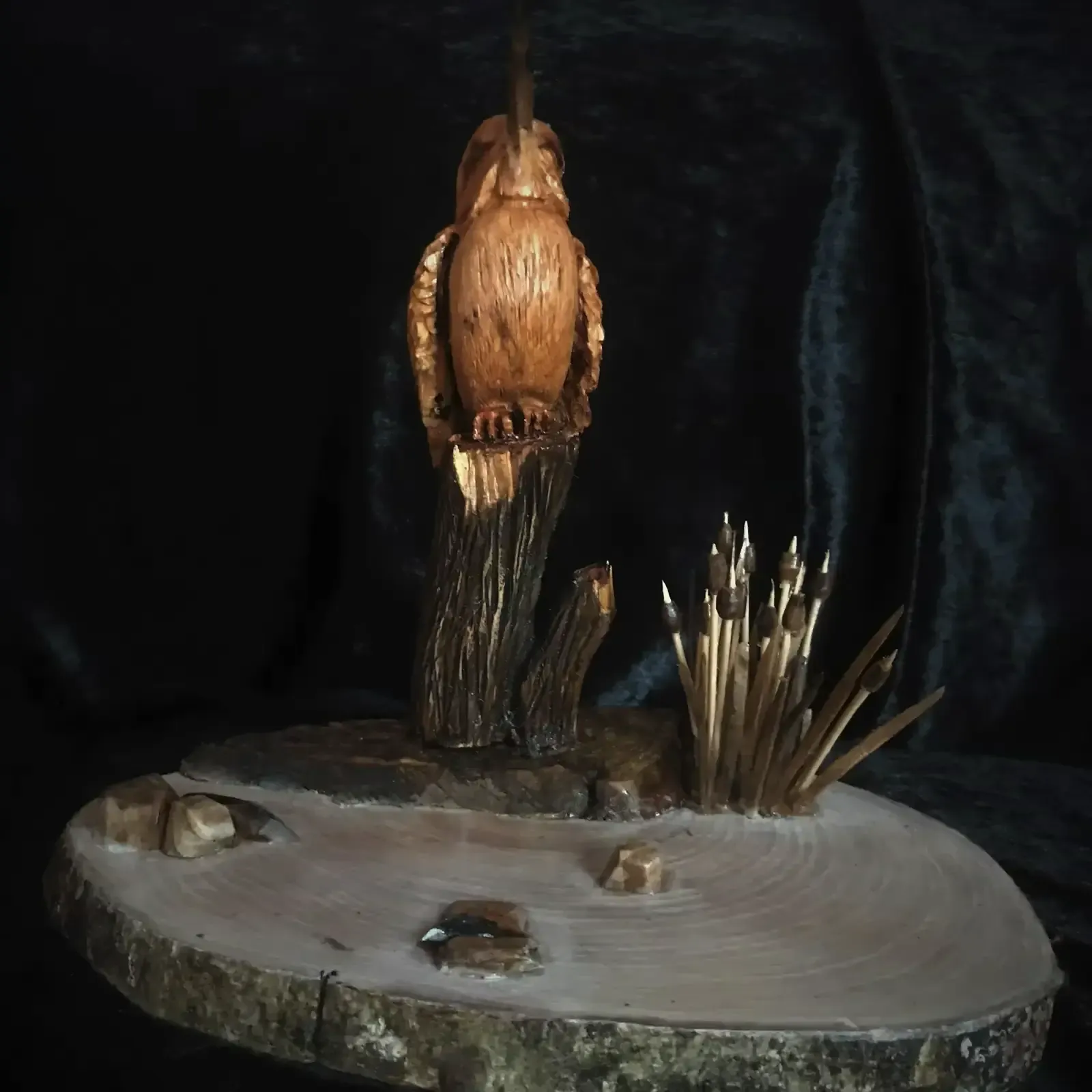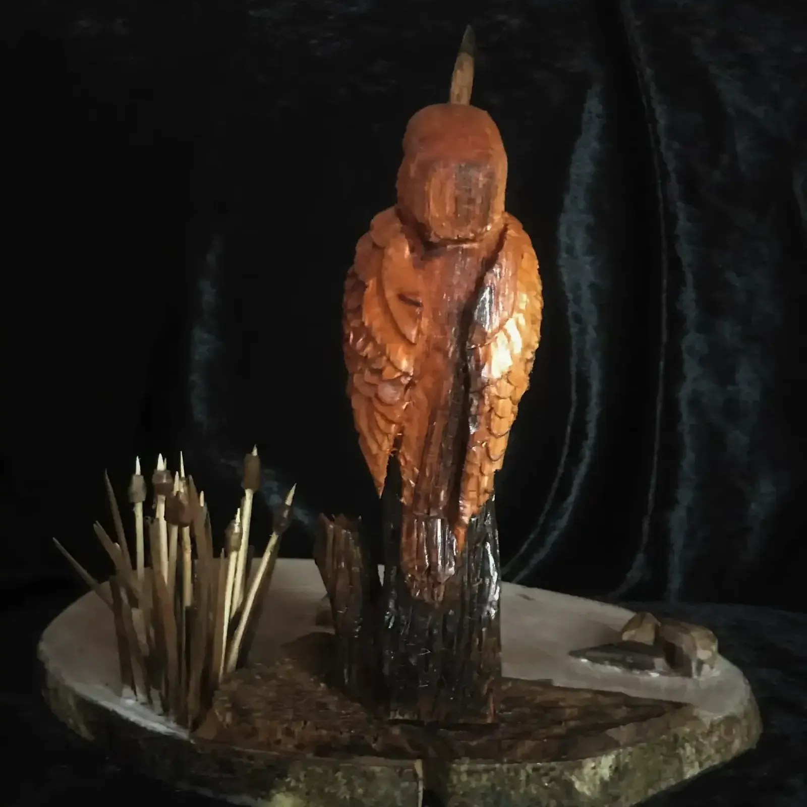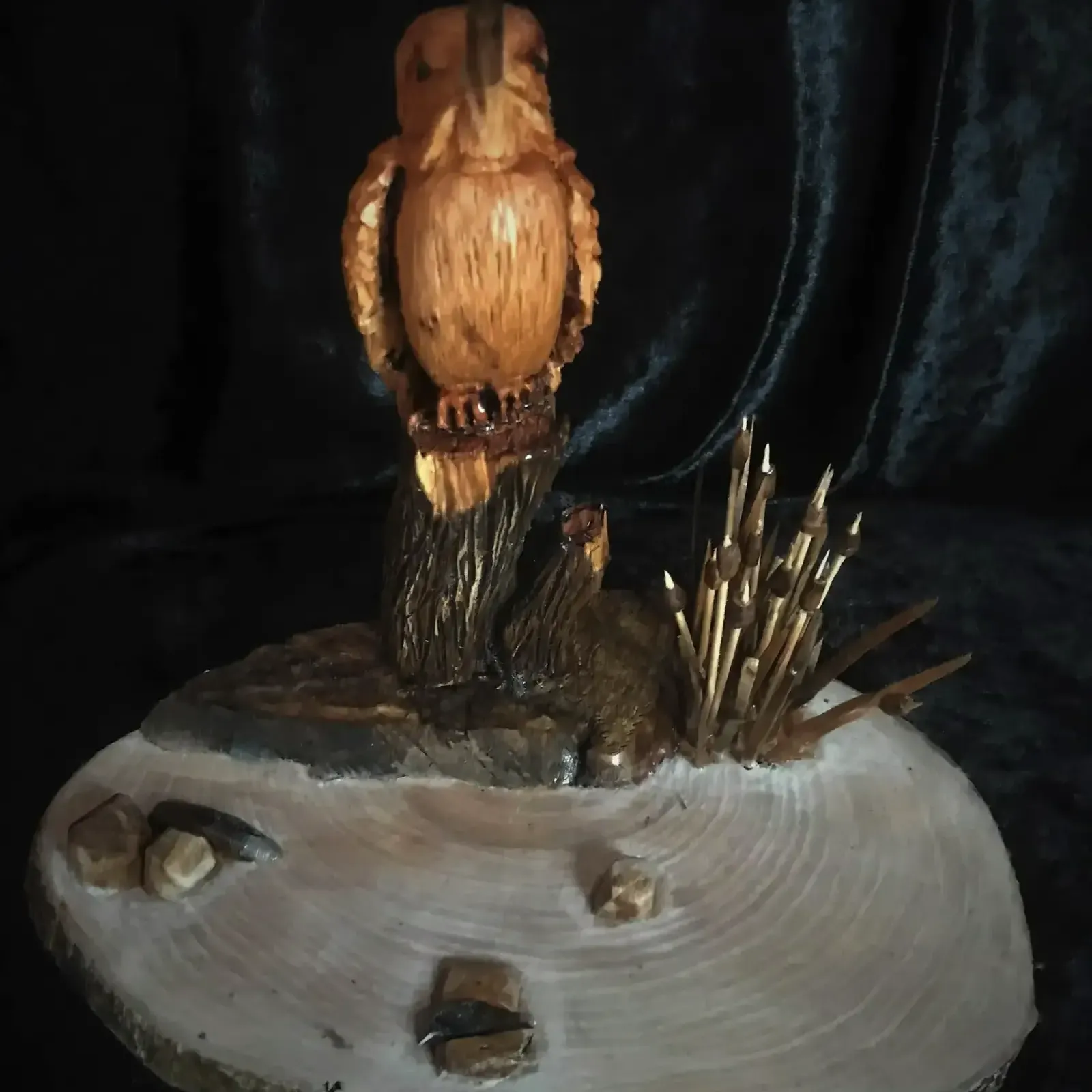 My original idea was to colour him with his full iridescent blues and greens and leave the breast naturally orange, but I’ve changed my mind on completion. I used the Beech base and bleached it but making sure I kept the wood rings visible to act as a ripple in the water. The embankment is cit out of a piece of burr walnut and the reeds (which are totally out of scale) are made from toothpicks and walnut shavings. the base is finished in an acrylic spray to give the glassy watery finish and the Kingfisher in a light coating of beeswax.