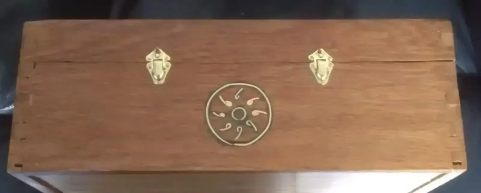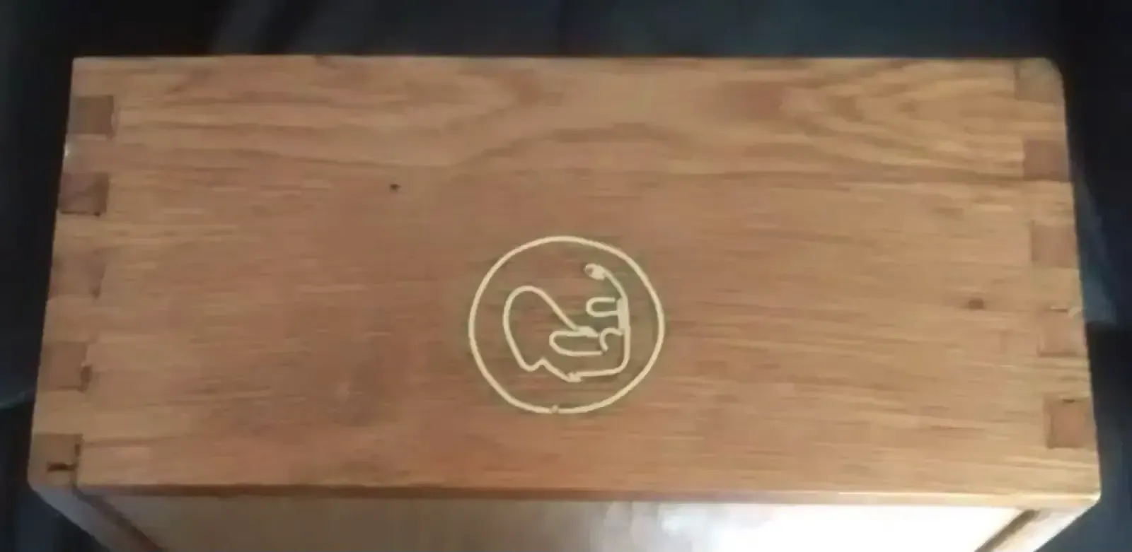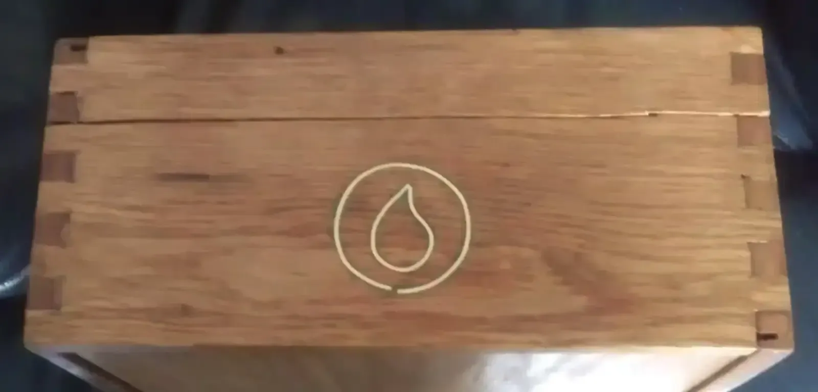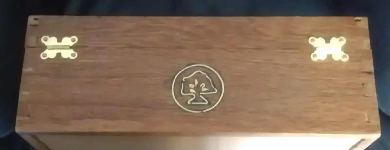 The box itself is made out of oak and has marquetry on the top and my first attempt at inlaying brass rod into the side of a project. The symbols on the top and side are element categories in the game which are attributed to the creatures within the cards.