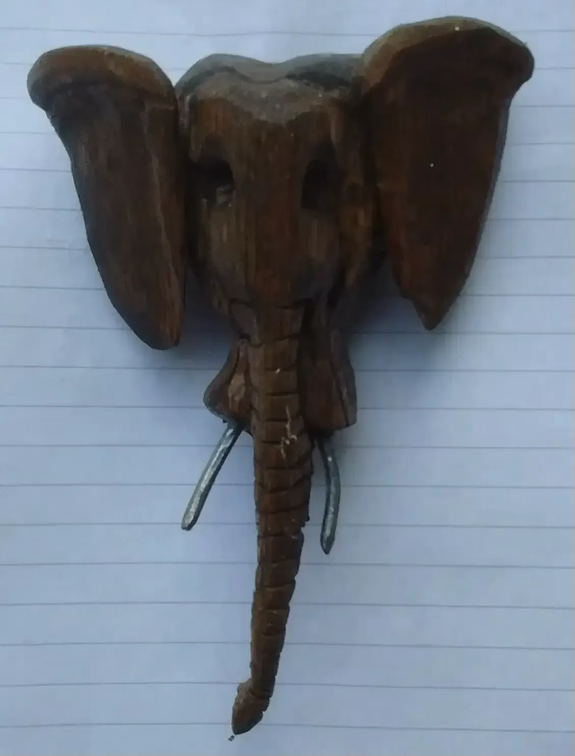 They were only about 4” in length and made out of ordinary pine, stained in dark oak. The tusks were made out of a galvanised nail and bent for effect. They were naively made but had the desired effect. Once the exams were finished the banner came back and one of the elephants hadn’t survived the trip. I kept this one as a reminder of her success in her exams as a dad’s keepsake.