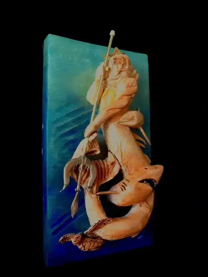 The trident is made out of brass and the carving is done on a close-grained piece of lime in order to get the detail around the head. The crown is coated in gold leaf for effect. I stained the background with ink stains to gain the vibrancy of colour and finished it with sanding sealer in order not to yellow the colours.