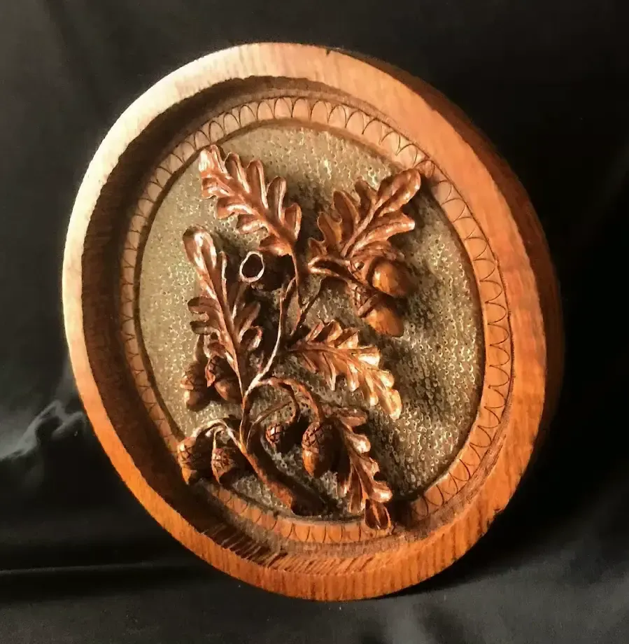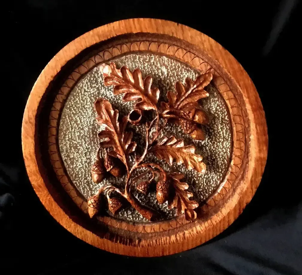 There is nothing like a lifesaving helping hand from an old friend!! Pinterest. Although it’s not an exact copy I thank the original designer for saving my Mams Christmas present. I carved it on an oak turning blank and the undercutting of the branches was tricky to do without breaking anything. I polished it with Danish oil to give it the lustre it needed and the background is stippled and covered in a lime/ash wash before lightly sanding it off to help with the differentiation between background and foreground.