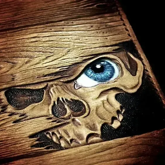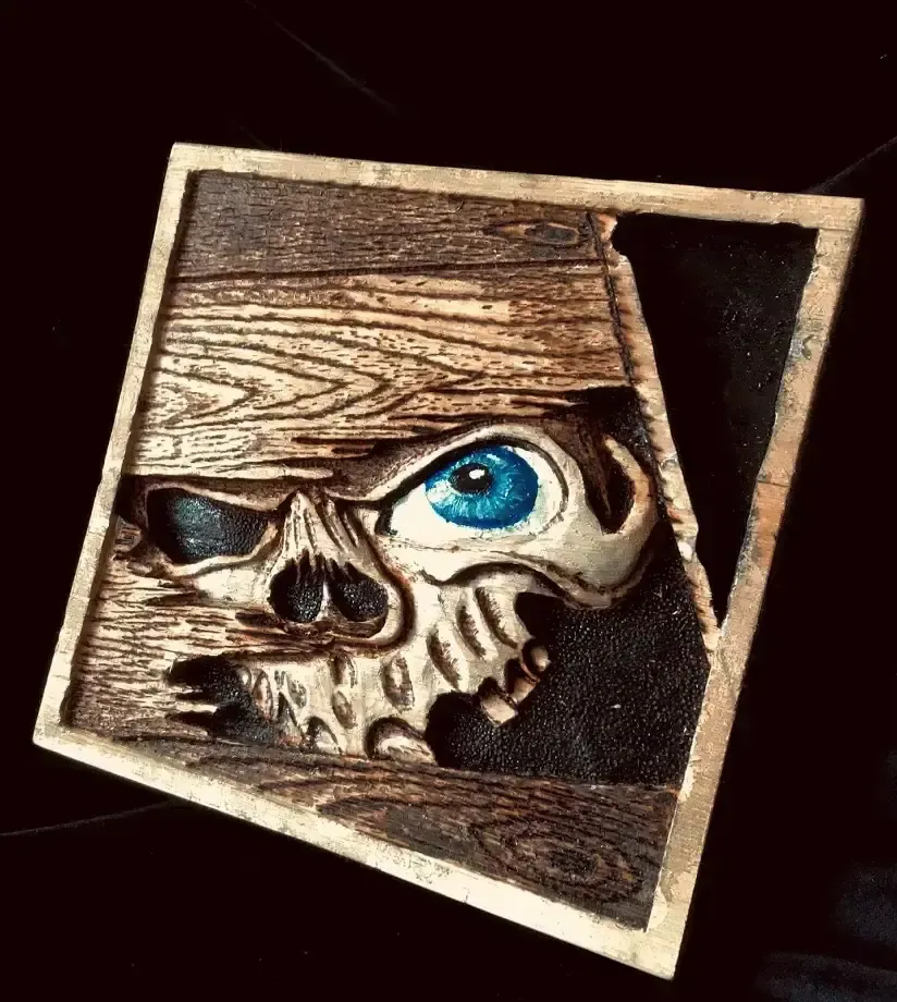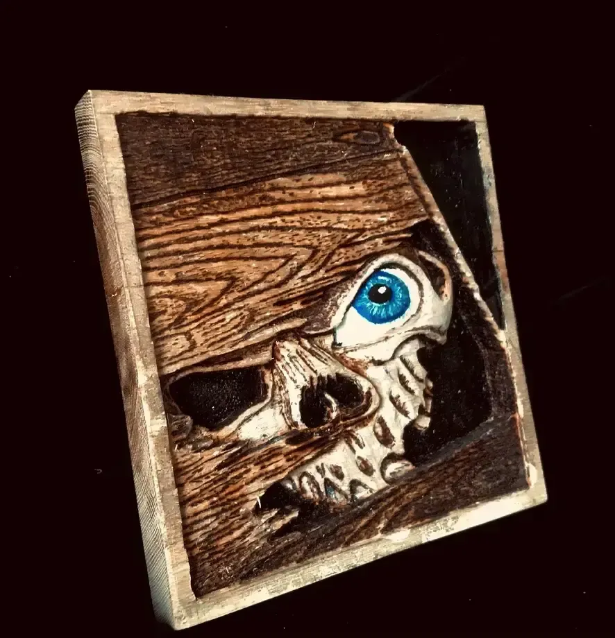 The skull in the box has been washed in an ash lime stain to lighten it slightly and the black background has been stippled with the pyrography pen to add texture and darken the backdrop. The eye was fun to do as it took several attempts to build the effect. This was so successful that when it was displayed at a local library, Peek-a-Booooo had to be moved from the cabinet as it caused concern to a receptionist nearby. I’m not wanting to frighten people, but it means the carving was noticed.