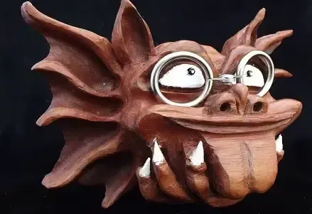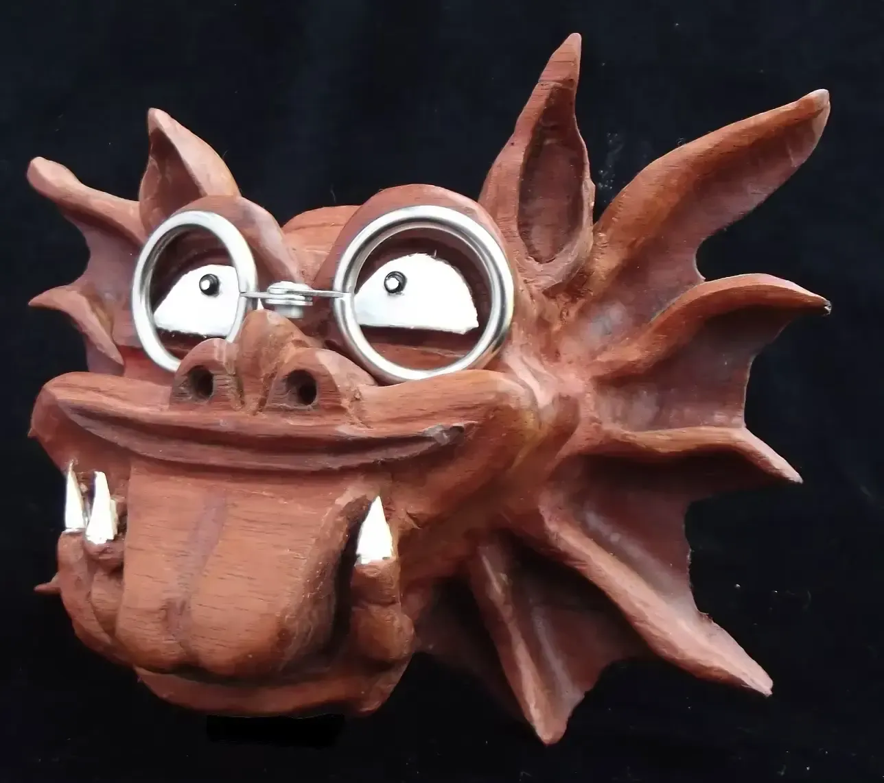 Gargoyles are a favourite subject of mine. This one was copied from a garden ornament I saw, but he had a couple of friends with him. I intend over time to reunite him with his brothers, but The Prof was the intelligent one out of the bunch. He’s made from Mahogany, stained with a deep red Mahogany to give more depth of colour and polished with beeswax. The glasses were an afterthought, made out of 2 curtain rail rings, pop riveted together. He’s a favourite with kids at displays.