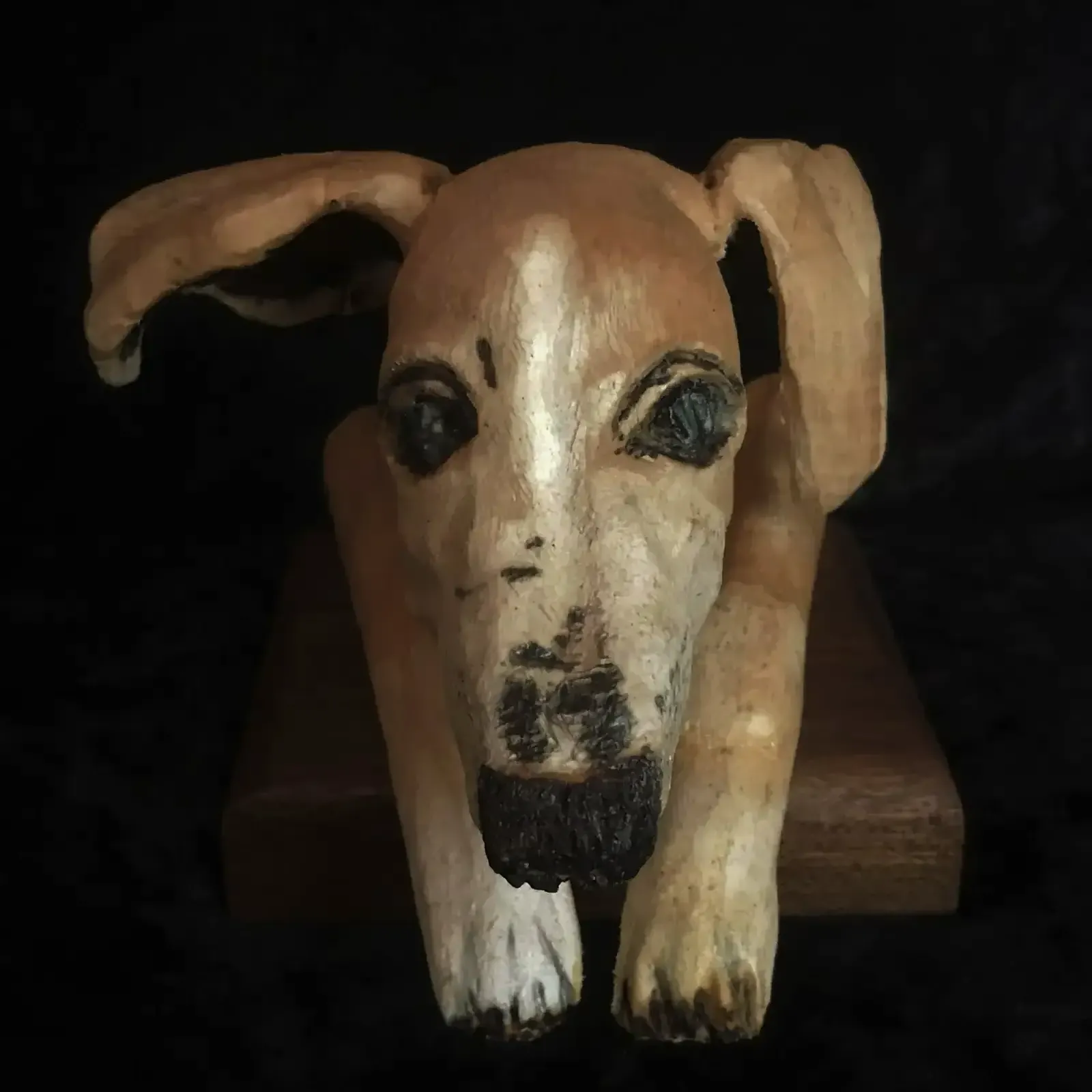And so to the Carving of Dante a present to our friends… I had thought to do a carving of both Dante and Brady, but I found Brady’s ears to be difficult to carve as they sloped off at strange and weird angles and the wood I was using snapped after both attempts, as they thinned out to the tips. Without his ears in the right places, I felt it lacked his character had I have chosen to include the poem. Dante was carved out of a piece of lime and bleached to get the whited parts of his fur. The face markings and eyes were darkened using pyrography and it was finished with a clear acrylic spray. Dante rests on a Mahogany bed in a playful stance. Although he lived to a good age, I have given him back some of his youth.