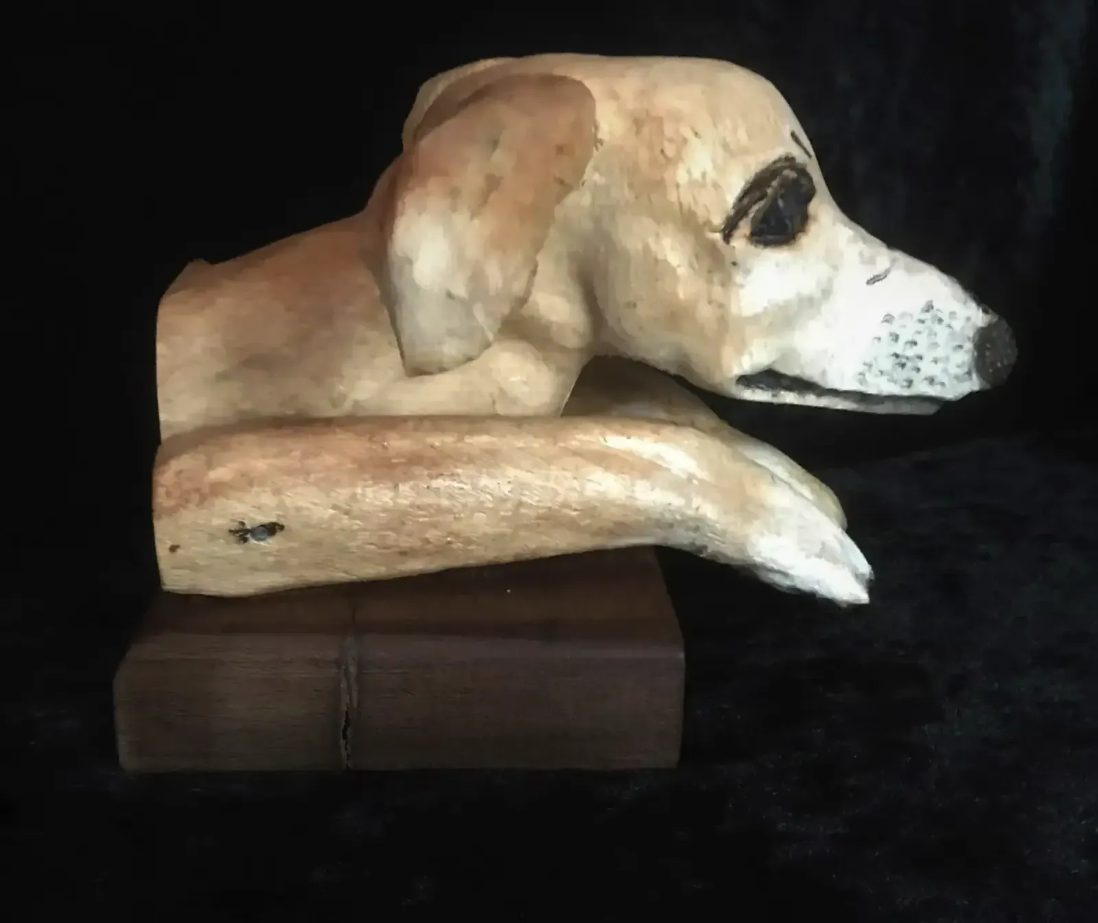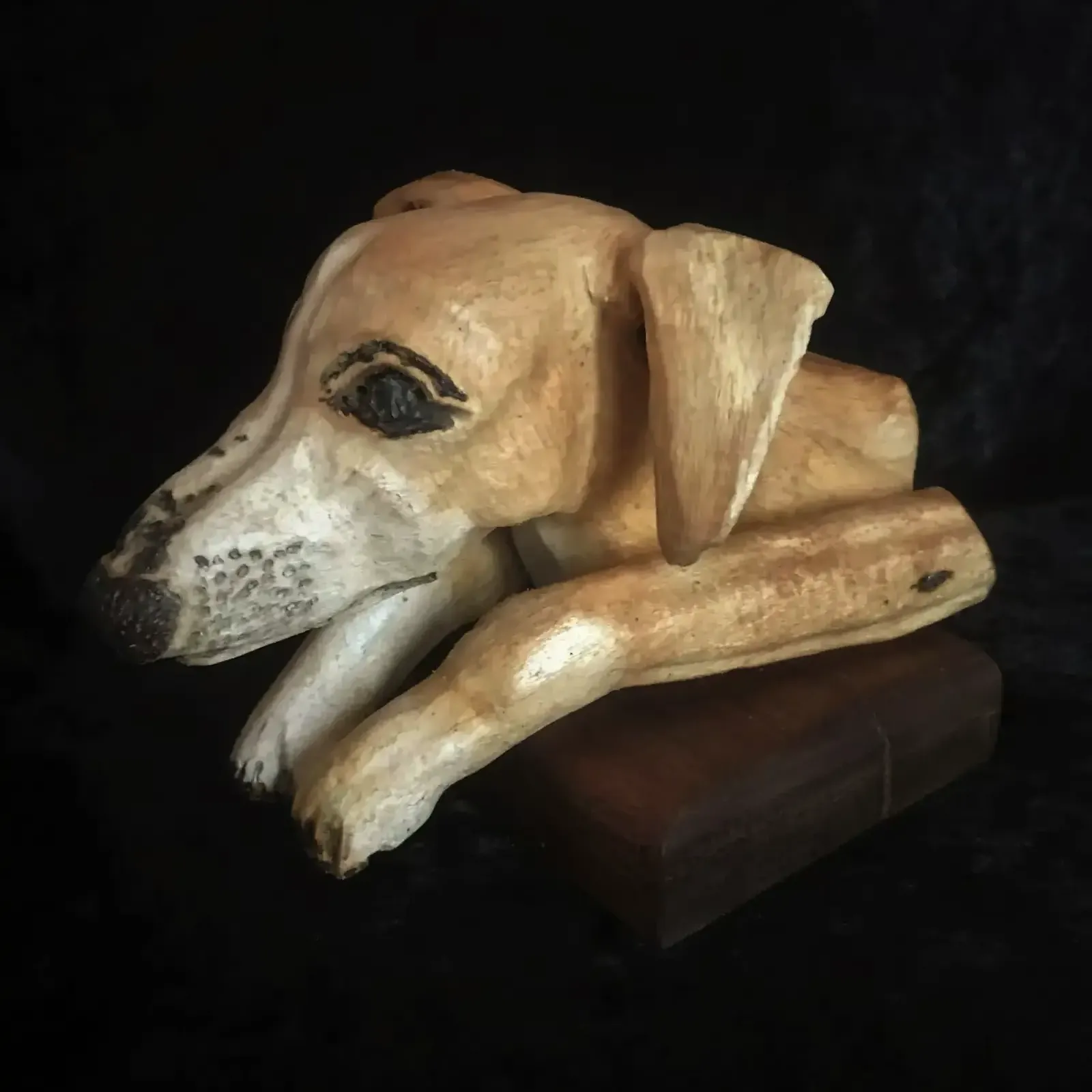 In Christmas 2019 we met up with some close family friends for coffee and I chatted to sons without our friends knowing, and organised them to send photos over of the dogs as I had planned to do a carving of their pets, Dante/Brady. Sadly they both died within a short time of each other in 2019/20. Both were rescue greyhounds and had lovely gentle characters as well as a great background story to Brady who was found wandering abandoned on the A1 at Bradbury Services by our friend. They were both given a cosy warm home, but mostly they were a family pet and were loved.
