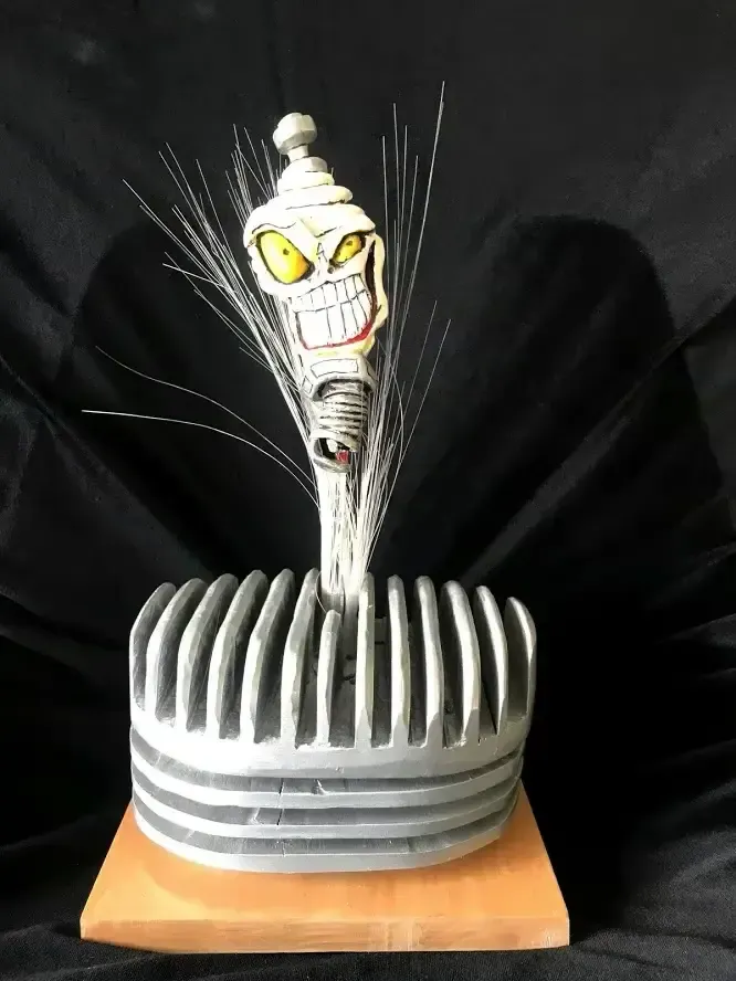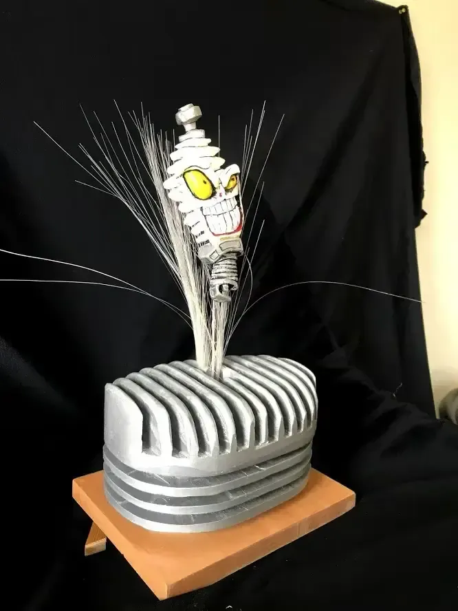 After a particularly annoying and heated event when I had blown my own gasket, the idea came to me. Sparky’s cylinder head is made out of a piece of Sapele Mahogany and spray painted in chrome paint. There is a space in the centre where the fibre optics and a mini smoke machine can be stored. When on display the flashing fibre optic lights and smoke give it some sense of theatre.