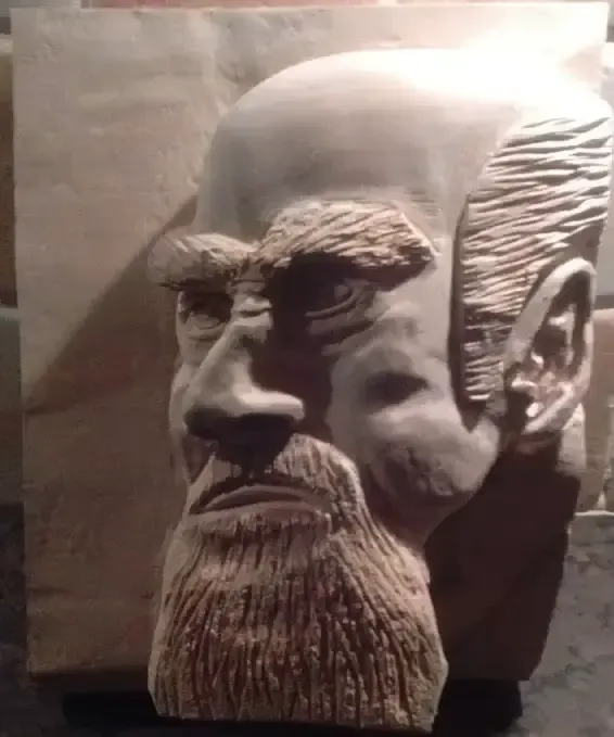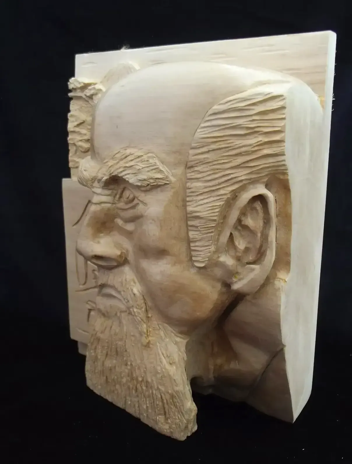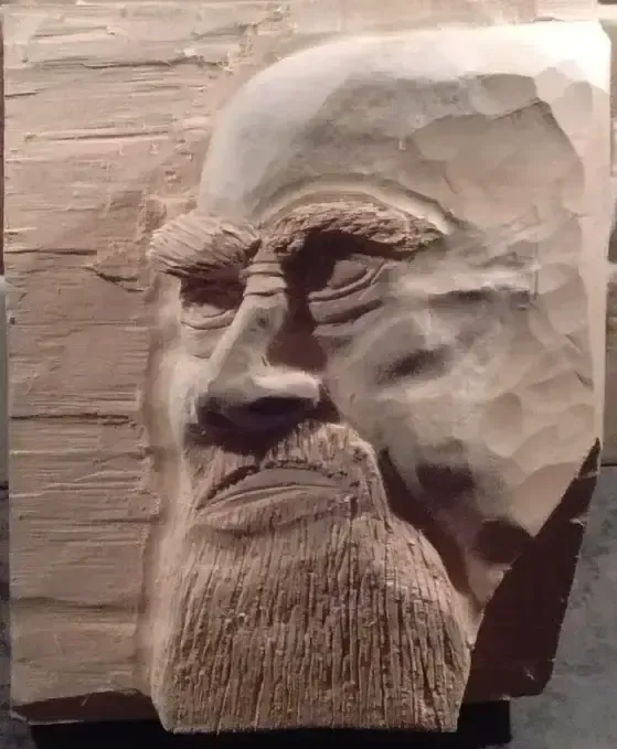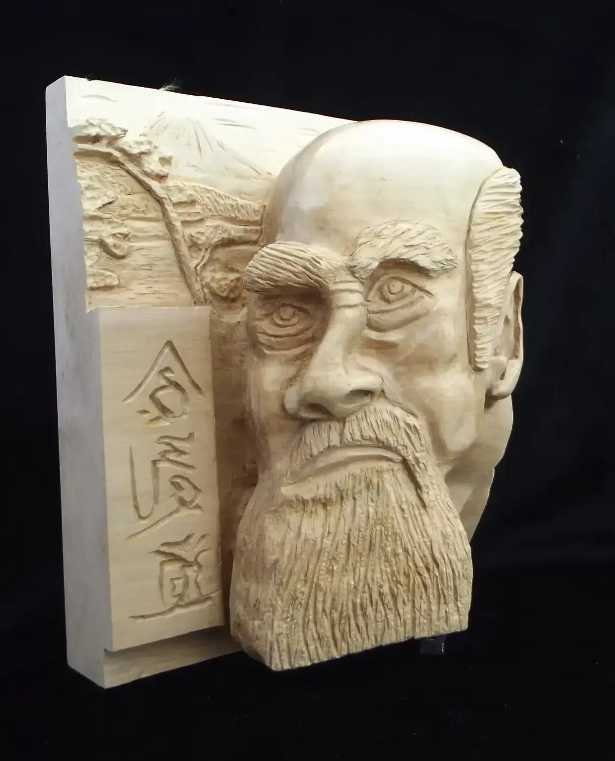 I was asked to carve this piece by a follower of Aikido. He wanted to place it in his dojo as a mark of respect. After researching Morihei Ueshiba, I was fascinated with his tale of how he came to create this fighting style. The piece was carved out of Italian Lime, a whiter, and a closer grained wood than our English Lime. The piece took eight weeks to complete, and I was highly delighted with the finished article. It was finished with beeswax which brought out a high lustre on the carving. The perspective owner forfeited the right to the piece when he refused to pay the agreed price. His loss, my gain. Thanks are given to Roy Mitchell for the use of this drawing of Morihei Ueshiba.