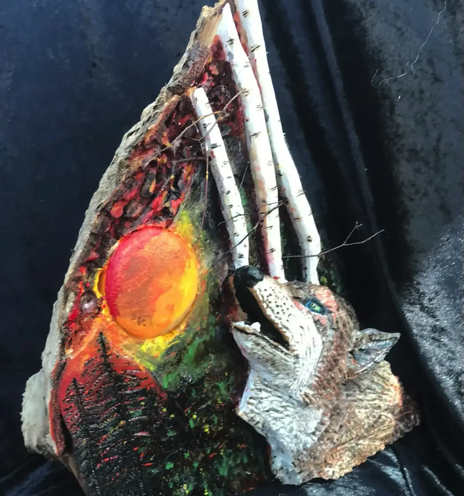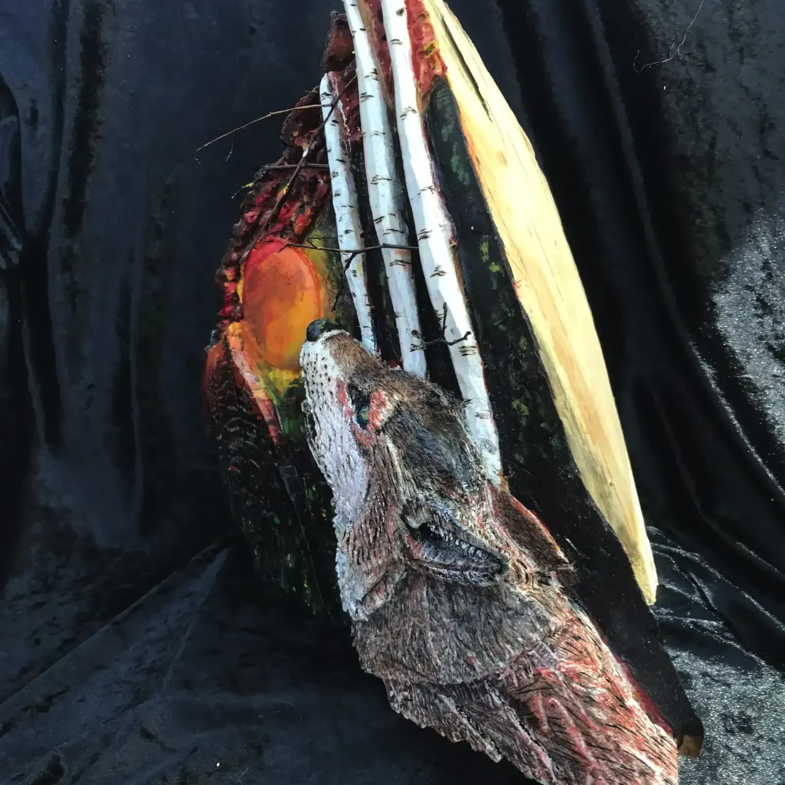 The scene depicts a wolf baying at a blood moon deep in the forest. The carving was done to help a fellow carver with the problems of perspective in an animal he was caving. It was carved out of a piece of Alder trunk and hand-painted. The moon was made out of a piece of Yew which had a particularly interesting knot which I cut out for this project. I have an interest in all cultures and the link with the wolf and the North American Indians is one I will continue to explore.